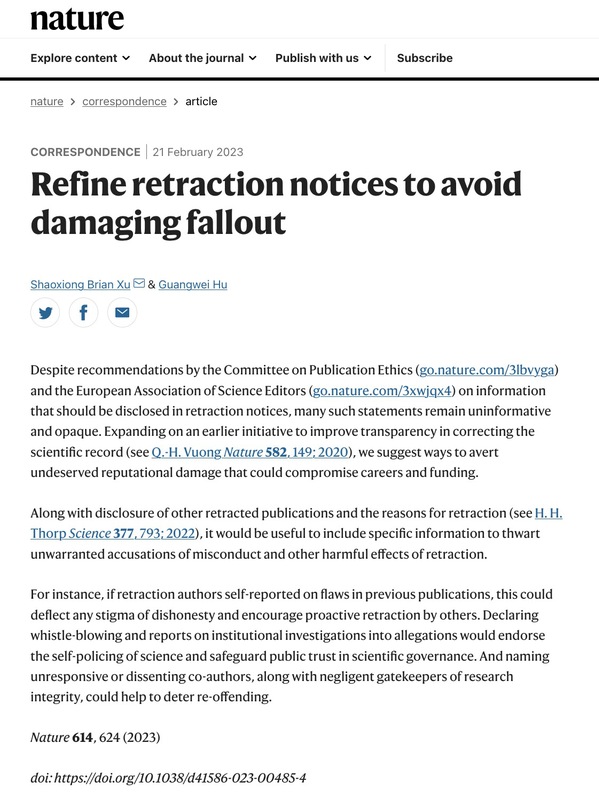 本网讯 2月21日,我校外国语学院徐少雄老师在国际知名学术期刊Nature(《自然》)的Correspondence(《通讯》)专栏,以第一兼通讯作者身份、我校为第一署名单位,发表题为Refine retraction notices to avoid damaging fallout(《优化撤稿通知,避免破坏性后果》)的评论文章。