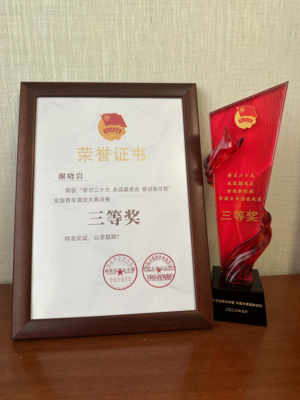 本网讯 用青春声音讴歌时代,让青春故事绽放光彩。5月3日下午,由共青团青岛市委、中国共青团杂志社共同举办的“学习二十大永远跟党走奋进新征程”全国青年演说大赛决赛在青岛广播电视台800平米演播大厅举行。我校学子谢晓岩在大赛中荣获三等奖、最佳风采奖。