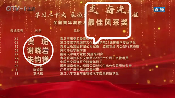 谢晓岩以《戎马为国耀理想,烽烟滚滚筑忠魂》为主题,以黄冈市抗美援朝老兵陈世礼为对象,讲述了他一生朴素、恪守原则的感人故事。谢晓岩号召新时代中国青年应以陈世礼为榜样,从其先进事迹中汲取精神力量,为党为国贡献青春力量!他表示,自己很荣幸能够取得这样的成绩,也感谢学校对他的支持和鼓励,今后将会继续致力于自己专业领域的研究和创新,将身边人的故事通过自己的声音传递给千家万户,讲好中国故事,传递中国声音,做有志气、骨气、底气的中国青年。
