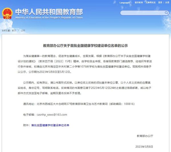 本网讯 2023年5月8日,教育部官网发布了《教育部办公厅关于首批全国健康学校建设单位名单的公示》,我校申报的建设全国健康学校立项获批,这是我校健康学校建设的历史性突破,标志着我校学校健康建设迈上了新台阶。