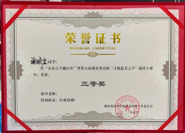 本网讯 5月19日,“青春之声越百年”暨第五届湖北省高校“寻找最美之声”诵读大赛决赛在武汉大学图书馆举行。我校学子谢晓岩荣获大赛三等奖,谢晓岩朗诵的作品《祖国到底是什么(节选)》、武清阳与杨恩发朗诵的作品《红烛》、张梓庚朗诵的作品《相信未来》荣获“网络人气作品奖”。我校图书馆荣获“优秀组织奖”,图书馆张巧珍老师荣获“优秀领队奖”。